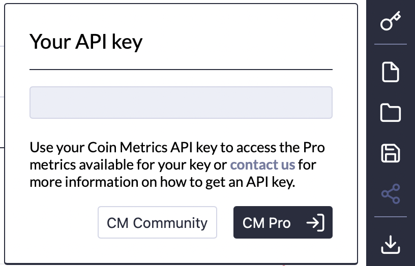 This suite of charting tools can be accessed directly at [Charts](https://network-charts.coinmetrics.io/) with or without an API key. Without an API key, you will have access to the community data from the above[ data sources.](#data-sources)
